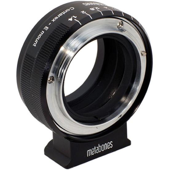 The black Contarex Mount Lens to Sony NEX Camera Lens Mount Adapter fromMetabones allows a Contarex mount lens to be attached to a Sony E-mount NEX format camera, including NEX full frame cameras. Metabones adapters are quality made, using precision-machined brass with chromium plating on both the camera-body and the lens sides of the adapter in order to ensure smooth mounting, quality aesthetic, and durability. This adapter has a detachable tripod foot that is compatible with Arca Swiss, Markins, and Photo Clam ball heads. Although the lens will fit physically, automatic diaphragm (AE metering), or other auto functions are not retained using this adapter.