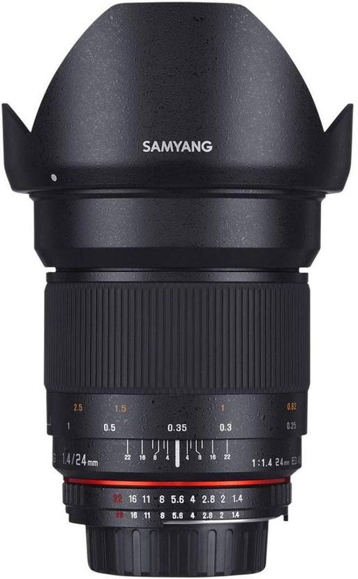 Samyang 24mm F1.4 ED AS IF UMC is a manual focus lens. The manual focus ring is wide, easily accessible and perfectly adaptable to most photographic applications. Accurate focus at very close distance or focus critical situations can be achieved through use of focusing in live view mode, available to most newer camera models. Furthermore the 24mm provides lovely bokeh (the character of out-of-focus areas), due to its design and fast aperture. Optical construction of the Samyang 24mm lens features 13 elements arranged in 12 groups, 4 of them low-dispersion glass (ED), and 2 of them aspherical. The 24mm is Ultra Multi Coated (UMC) for the best possible light transmission, and reduction of ghosting and flare. Supplied with detachable petal shaped lens hood, lens caps and soft lens bag. Filter size is 77mm.
